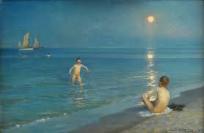 Det er tidligt på sommeren. To drenge løber til stranden for at bade. Den ene går forsigtigt et lille skridt ud og føler på vandet. Han finder det altfor koldt og bliver stående og småfryser uden at vove sig i. Den anden er mere modig, han sætter af og hopper lige i. Da han kommer op efter springet, råber han: »Vandet er friskt og dejligt.«